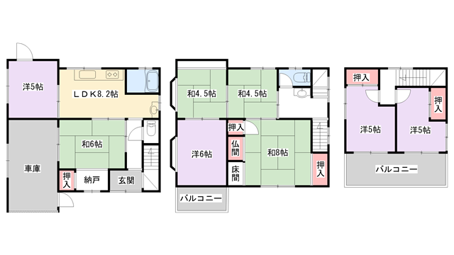 和室8帖、和室6帖、和室4.5帖、和室4.5帖、洋室6帖、洋室5帖、洋室5帖、洋室5帖、LDK8.2帖 |