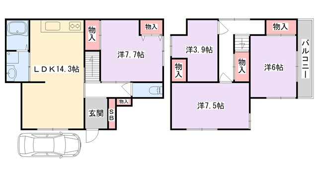 洋室7.7帖、洋室7.5帖、洋室6帖、洋室3.9帖、LDK14.3帖